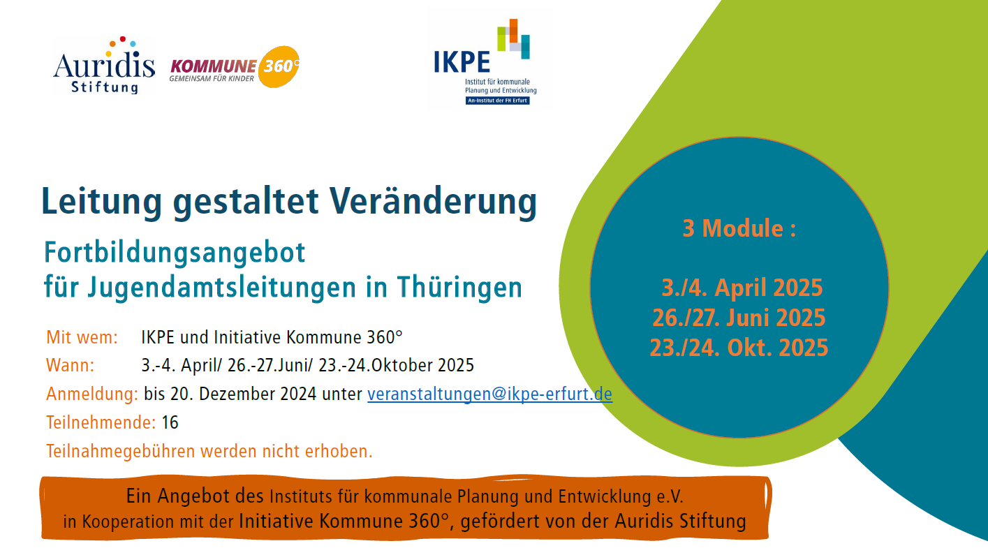 Das IKPE e.V. bietet in Kooperation mit Kommune 360°, gefördert von der Auridis Stiftung, eine Fortbildung an, die sich gezielt an Leitungen von Jugendämtern in Thüringen als gestaltende Akteur*innen für gelingendes Aufwachsen von Kindern und jungen Menschen richtet. Im Mittelpunkt der Fortbildung steht der Anspruch "Leitung gestaltet Veränderung", mit dieser Erwartung sind Führungskräfte oft konfrontiert.