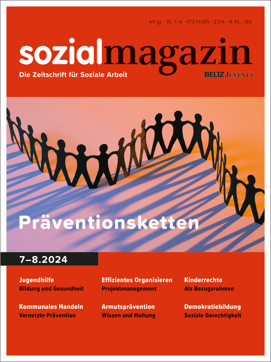 Präventionsketten sind systematisch vernetzte Maßnahmen und Angebote, die darauf abzielen, frühzeitig und ressourcenorientiert soziale Probleme zu adressieren, Risiken zu identifizieren und präventiv zu begegnen. Das Themenheft bereitet den aktuellen Wissensstand basierend auf Erfahrungen aus mehreren Bundesländern sowie bundesweiten Aktivitäten auf. Es hinterfragt den Status quo kritisch, zeigt neue Tendenzen auf und lädt zum Ausprobieren ein. Die Beiträge reichen von ersten kommunalen Schritten bis hin zu Erkenntnissen erfahrener Akteur*innen, wissenschaftlichen Analysen und politischer Einordnung. Mit der thematischen Auswahl wird ein breites Spektrum an Zugängen und Fragestellungen abgedeckt, um Weiterdenken und Selbstvergewisserung in Ausbildung, Praxis und Wissenschaft zu fördern.
