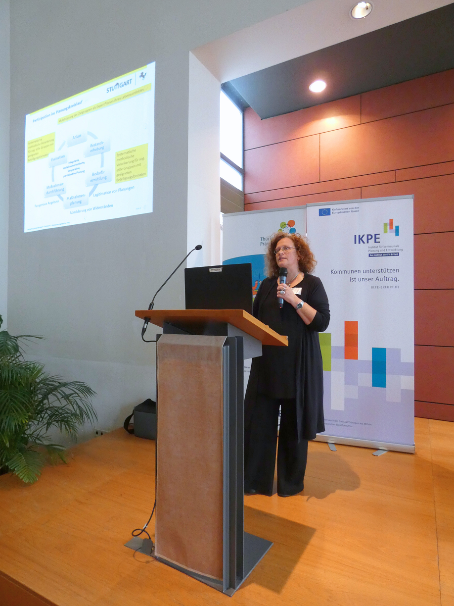 Der Fachtag wurde mit zwei Abschlussinputs beendet. Sabrina Pott, Sozialplanerin aus Stuttgart, gab wertvolle Einblicke in die Beteiligungspraktiken ihrer Stadt und ermöglichte einen Perspektivwechsel. Sie betonte die Wichtigkeit der kontinuierlichen Reflexion und Qualitätsentwicklung in Beteiligungsprozessen. In der abschließenden Reflexion des Instituts für kommunale Planung und Entwicklung e.V. fasste Dr. Heike Schaarschmidt zusammen, dass die Lebensweltperspektive der Adressat*innen erforderlich sei und die professionelle Perspektive ergänze. Sie motivierte, die Menschen in ihren Alltagsbezügen aufzusuchen, teilhaben zu lassen und Angebote davon ausgehend zu gestalten. Niedrigschwellige Beteiligung habe sehr viel mit Haltung der Akteur*innen zu tun, was über den gesamten Fachtag immer wieder aufgezeigt wurde.